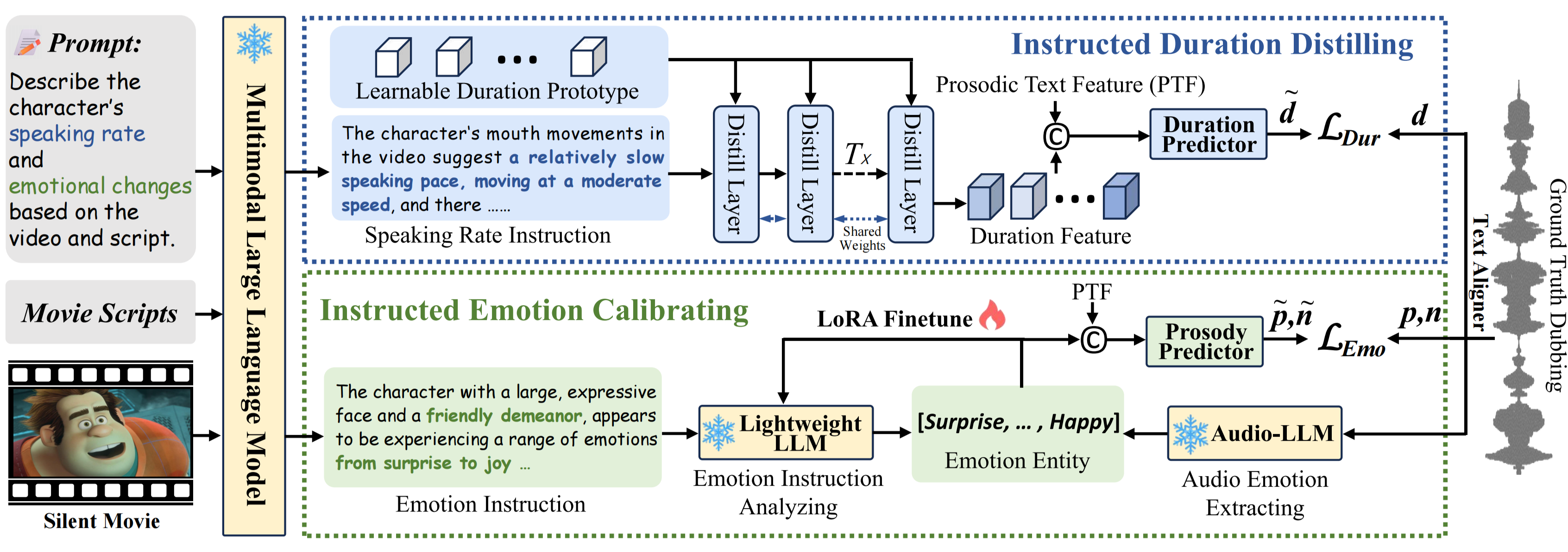 The main architecture of the proposed InstructDubber. To predict the lip-synchronized phoneme-level duration, the Instructed Duration Distilling module (IDD) mines the duration cues from fine-grained speaking rate instructions. The Instructed Emotion Calibrating module (IEC) fine-tunes a lightweight LLM to analyze the emotion instructions using the emotion entities from ground truth dubbing as supervision, and predicts the dubbing prosody based on the calibrated emotion analysis.